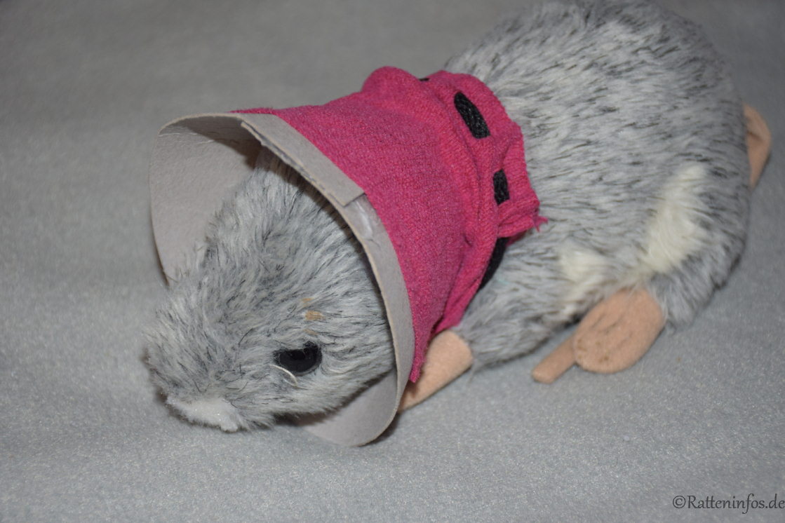 Weil ich mir die Fäden nicht noch ein zweites mal ziehen durfte, bastelte Mama viele Sachen, die meine Wunde verdecken sollten. Unter anderem Halskrausen, Rattenbikinis, Hosen und Anzüge aus Socken. Diese wurden zunächst immer an einer Plüschratte ausgetestet  😆